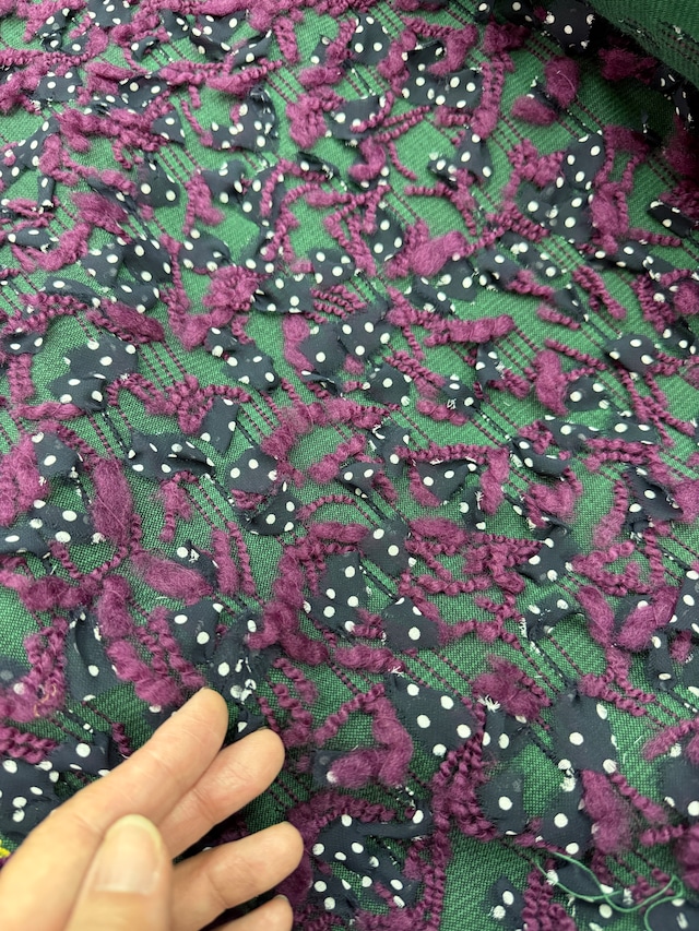 ※ピンク・プロジェクト終了までのあいだ、在庫管理のため受注を停止しています。 グリーンのフラットなベースに水玉のリボン糸、ボルドーの太さに強弱つけた毛糸が吹き出す様子から、葡萄畑をイメージして名付けました。バッグ、スカートやワイドパンツに、全面あるいは部分的にに使うのもおすすめです。